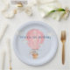 Personalised, cute pink and blue birthday paper plates with watercolor Illustration of bunny rabbit in hot air ballon.