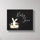 Sweet stretched canvas with “Baby Love” in script with the cutest little bunny in a rattan basket. Classic black background for a dramatic look. Perfect for baby’s nursery. 100% customer satisfaction at “Zazzle”
