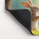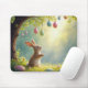 A curious bunny sits under a tree adorned with colourful, hanging Easter eggs, enjoying the serene morning light