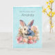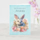Birthday card with a watercolor image. A white gray bunny rabbit surrounded by a garland of pink and peach roses. For bunny lovers and Easter themes and birthdays and showers.