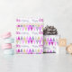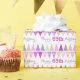 Birthday bunting triangular flag style patterned wrap ideal for girls birthdays or other occasions. Personalise with your own birthday age and letters for your name on the bunting currently reads Dorothy Happy 65th Birthday. Wrapping paper in colourful pink, purple, golden and blue grey pastel shades on white. Designed by Sarah Trett.