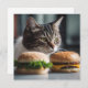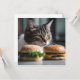 A serene tabby cat sits calmly, with two cheeseburgers placed in front of it, seemingly waiting for the perfect moment to indulge. The cat's gentle gaze is introspective, lost in thought as it contemplates the deliciousness before it. The simplicity of the image belies its charm, as the subtle details of the cat's fur and the tantalising burgers come together to create a delightful visual treat. Created using AI technology, this design is available on a variety of Zazzle products, from clothing to home decor and more, ready to bring a touch of feline whimsy to your daily life