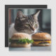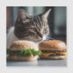 A serene tabby cat sits calmly, with two cheeseburgers placed in front of it, seemingly waiting for the perfect moment to indulge. The cat's gentle gaze is introspective, lost in thought as it contemplates the deliciousness before it. The simplicity of the image belies its charm, as the subtle details of the cat's fur and the tantalising burgers come together to create a delightful visual treat. Created using AI technology, this design is available on a variety of Zazzle products, from clothing to home decor and more, ready to bring a touch of feline whimsy to your daily life