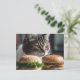 A serene tabby cat sits calmly, with two cheeseburgers placed in front of it, seemingly waiting for the perfect moment to indulge. The cat's gentle gaze is introspective, lost in thought as it contemplates the deliciousness before it. The simplicity of the image belies its charm, as the subtle details of the cat's fur and the tantalising burgers come together to create a delightful visual treat. Created using AI technology, this design is available on a variety of Zazzle products, from clothing to home decor and more, ready to bring a touch of feline whimsy to your daily life