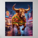 Massive burger bull artwork featuring a powerful bull made from stacked buns, grilled beef textures, melted cheese layers, lettuce folds, tomato accents, and sesame highlights. Charging through a neon ranch district with retro diners, chrome signs, classic cars, sizzling grills, wet pavement, and city glow, this energetic fantasy animal design feels bold and modern. Perfect for game rooms, kitchens, diners, man caves, restaurants, or statement interior décor.
