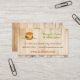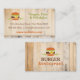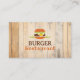 A rustic business card for restaurants and grills with a burger icon design on an attractive wood background.