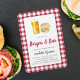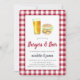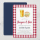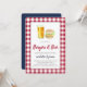 Casual "burgers & beer" rehearsal dinner invitations feature watercolor illustrations and a red and white gingham border. Perfect for summer or outdoor rehearsal dinners, these casual chic invitations are easily customised with your celebration details.