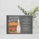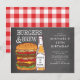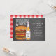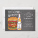 Modern and fun chalkboard burgers & brew barbecue adult birthday party invitation featuring a bottle of beer with a huge hamburgers set on a black chalkboard background & a matching red chequered cloth back for a special touch .