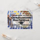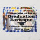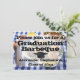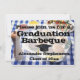 Summertime backyard bbq graduation party invitation. Fresh hamburgers, ketchup, mustard, shiskebobs off the grill. Blue and white chequered tablecloth background.