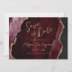 This elegant wedding save the date card features a background image of burgundy red watercolor agate trimmed with faux gold glitter. The customisable text combines gold-coloured modern handwriting, copperplate and italic fonts. The reverse side features a coordinating burgundy and gold agate design.