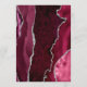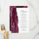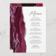 This elegant modern wedding menu features a burgundy red watercolor agate border trimmed with faux silver glitter. The customisable text combines charcoal grey handwriting script and sans serif fonts on a white background. The burgundy and silver agate design is repeated on the reverse side.