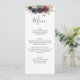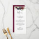 Our modern wedding menu features a burgundy and blue watercolor flowers arrangement.