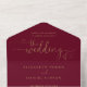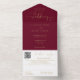 All in one burgundy and gold wedding invitation featuring elegant hearts script typography and monogram initials. The invitation includes a perforated RSVP card with your wedding website QR code and details. Designed by Thisisnotme©