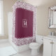 Burgundy and white damask pattern and square with scalloped borders shower curtain. It showcases a burgundy red square with scalloped borders in the centre with a damask border and your monogram. You can personalise it with your family name and monogram.