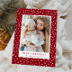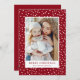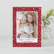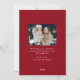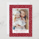 Modern holiday card featuring your vertical photo on the front framed in white with a background of burgundy and white snowballs. Personalise the front of the card with your custom greeting and family name in bold burgundy lettering. The card reverses to display an additional photo with your custom message displayed below.