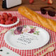 A chic Burgundy Bloom bridal shower plate features burgundy marsala, blush pink, and purple flowers. Includes whimsical hand lettered script and sans serif headline.