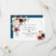 Elegant card design featuring watercolour burgundy blush flowers and green leaves, a faux gold glitter broken frame, floral divider, on a white background. On the back the same flowers bouquets on ocean blue background. Use Personalise tool to add your info, change fonts, font's colours. For matching items, please, visit my Watercolor Flowers Gold Frame Collection.