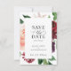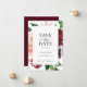 Elegant watercolor floral, save the date wedding announcement. Artsy watercolor floral bouquet in burgundy and blush pink with burgundy red colour backing. Part of a collection.