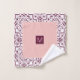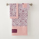 Burgundy and white damask pattern and blush pink scalloped borders Bath Towel Set. The bath towel features an elegant burgundy red and white damask pattern and pink bands on the short sides with scalloped edges. There is also a frame with your family name. The hand towel showcases a scalloped border around it while the whash cloth is blush pink in the centre with a burgundy damask border and your monogram. You can personalise it with your family name and monogram.