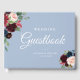 This guestbook features beautiful watercolor flowers with a burgundy dusty blue floral theme. Feel free to personalise the text and colours.