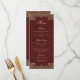 This elegant burgundy wedding menu with a vintage air, recommended for a more formal, "black tie" wedding, has on both sides golden baroque decorations on the upper and lower borders, on a burgundy red background. The title "Menu" and the subtitles are written in a calligraphic script. All text can be personalised and has a golden colour similar to the golden borders.