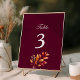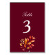 Add a stylish seasonal touch to your reception with this fall wedding table number card. Featuring a rich burgundy background and vibrant watercolor autumn leaves, this design is perfect for rustic or elegant weddings in September, October, or November. Bold numbering and classic typography make seating easy and beautiful.