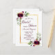 On front: A white background with a faux gold frame. Decorated with dark burgundy flowers, roses, boho style feathers and greenery. Templates for the bride's name and party details. The name and the text: Bridal Shower are written with a hand lettered style script, bugundy coloured letters.