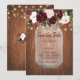 Perfect for country boho weddings, these rustic floral save the date cards feature a bouquet of burgundy and blush flowers on top of a mason jar with the important text inside. String lights decorate the top of the design, with a rustic wood background.