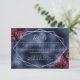 This elegant modern wedding details enclosure card features a silver geometric frame decorated with burgundy flowers and silver faux glitter on a navy blue faux foil background. The customisable text combines silver grey whimsical handwriting and copperplate fonts. The navy blue foil image is repeated on the back.