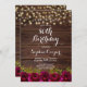 Rustic burgundy red, marsala watercolor roses, botanical floral arrangement wedding design with green leaves and string lights on dark brown barn wood. Feature an elegant handwritten typography design. Great choise for adult birthday party for her: 13th 15th 16th 18th 20th 21st 30th 40th 50th 60th 70th 80th 90th 100th, or any ages. Please note, this design is a printed photo effect with no wood. #3348