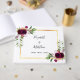 A modern elegant guest book decorated with watercolored roses in burgundy with feathers and greenery. With a faux gold frame. White background on the front. Templates for your names and wedding date. The names on front are written with a modern and trendy hand lettered style script. Black coloured letters.