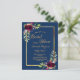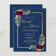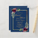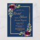 On front: A navy blue background with a faux gold frame. Decorated with dark burgundy flowers, roses, boho style feathers and greenery. Templates for the bride's name and party details. The name and the text: Bridal Shower are written with a hand lettered style script, golden coloured letters.