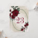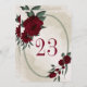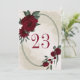 Unique pretty table number card featuring romantic burgundy flowers and green leaves on a beautiful geometric frame .