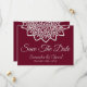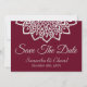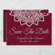 Elegant Burgundy Save the Date Card with an intricate faux glitter silver text and Mandala floral design representing the blossoming of Purity within our Soul. The colour Burgundy increases energy in a thoughtful, dignified and controlled way. Encourages feelings of warmth and comfort. Perfect for a beautiful Autumn and Winter reserved ceremony. You can change the text from the Personalise menu. Original Design by SunFreeStar.