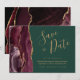 This elegant modern save the date card features a burgundy watercolor agate border trimmed with faux gold glitter. The customizable text combines gold-colored handwriting script, copperplate and italic fonts on a dark emerald green background. The reverse side features a matching burgundy and gold agate design.