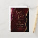 This elegant modern save the date postcard features a burgundy watercolor agate background trimmed with faux gold glitter. Easily customise the gold-coloured modern script and sans serif text on the front. On the reverse side, edit the customisable return address and enter your wedding website URL to generate a QR code your guests can scan to learn more about your upcoming event.