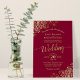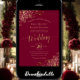 This beautiful wedding invitation features a simple yet elegant design with lacy script calligraphy on a maroon or burgundy red background and frilly gold faux foil filigree in the corners. The wording is formal, but the layout is modern and stylish.