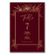 This burgundy gold floral simple wedding table number features a gorgeous sophisticated dark merlot backdrop with elegant gold calligraphy and gilded floral embellishments. The jewel-tone colour story and the golden botanical boho accents together with minimal delicate script create a regal and romantic modern aesthetic that strikes a perfect balance between classic traditional vintage and contemporary casual, making it an easy choice for a diverse variety of weddings and events. As with all of our designs, if you have any questions or special requests for coordinating products, please reach out to us.