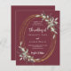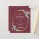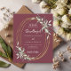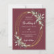 A burgundy background. Decorated with greenery and a golden oval frame. Personalise and add your names and details.