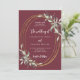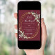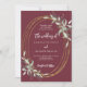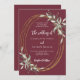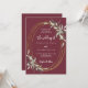 A burgundy background. Decorated with greenery and a golden oval frame. Personalise and add your names and details.