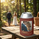 Elegant can cooler featuring your custom photos on front and back, framed by a burgundy and gold design with stylised "love" script text (optional). Beautiful as a wedding gift, to use at the reception, or keepsake. And customisable for any other occasion.