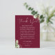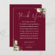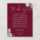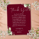 An elegant burgundy floral greenery wedding celebration thank you reception card. Personalized with your special thank you message set in stylish typography. A special keepsake thank you to your guests. Designed by Thisisnotme©