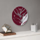 Modern clock features a minimalist design in a burgundy and grey colour palette. A simple illustration of organic leaves with a stylish watercolor Memphis style design element in the lower right hand corner.