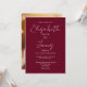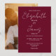 This burgundy minimalist elegant script wedding invitation can be personalised with your information in chic typography and special photo on the reverse. Designed by Thisisnotme©