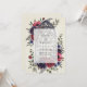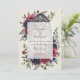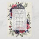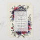 This design features a sophisticated blend of moody tones and architectural elegance. Deep burgundy anemones and navy blue roses surround detailed cathedral tracery. Delicate blue thistles and sage green foliage add texture against a vintage cream backdrop. The aesthetic evokes a romantic and ornate atmosphere perfect for a winter or autumn event.