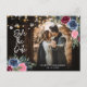 Custom navy blue and burgundy wedding photo save the date postcard featuring floral arrangements on a barn wood adorned with string lights. Easily personalise this floral wedding photo save the date postcard with your event details.