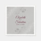 These beautiful napkins will make your wedding reception something special. They feature a simple yet elegant design with burgundy or wine red coloured text on a grey background with a lacy silver faux foil curls and swirls in the corners. Easily personalise with your names and the wedding date.