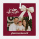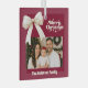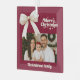 A burgundy, wine red background, cream coloured text and a bow. Text and photo. Merry Christmas is written with a retro style font.
