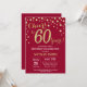 60th Birthday Invitation with Burgundy Red and Gold Glitter Diamond Background. Gold Confetti. Adult Birthday. Male Men or Women Birthday. For further customisation, please click the "Customise it" button and use our design tool to modify this template.