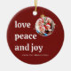 This minimalist design features a classic "Love, Peace and Joy" message, heartfelt wishes, modern and elegant typography on warm burgundy red background. Paired with a playful Christmas bauble photo frame this ceramic ornament is perfect for anyone seeking truly personalised holiday gifts with a joyful touch. Fully customisable with your photo and names. Ideal for spreading Christmas joy with contemporary flair and timeless elegance.